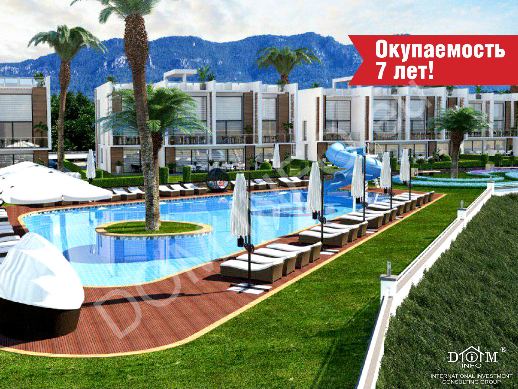Комплекс состоит из общего бассейна и 7 блоков двухэтажных зданий, которые включают квартиры 1 + 1, 2 + 1, а также пентхаусы. Из окон открывается панорамный вид на горы и море.